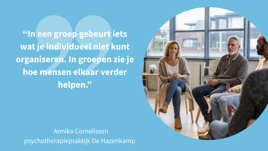 Zoals klinisch psycholoog en psychotherapeut Annika Cornelissen, bestuurslid LVVP,  die samen met haar collega psychotherapiepraktijk De Hazenkamp runt. In hun praktijk is groepsbehandeling geen aanvulling op de individuele zorg, maar bestaat het overgrote deel van de behandelingen uit groepspsychotherapie. “In groepen zie je hoe mensen elkaar verder helpen,” zegt Annika. “Er ontstaat herkenning, hoop en beweging, juist doordat mensen samen leren en kunnen oefenen met nieuw gedrag.”